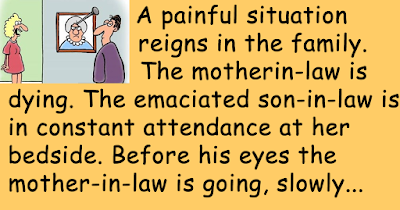 The mother-in-law is dying. The emaciated son-in-law is in constant attendance at her bedside.